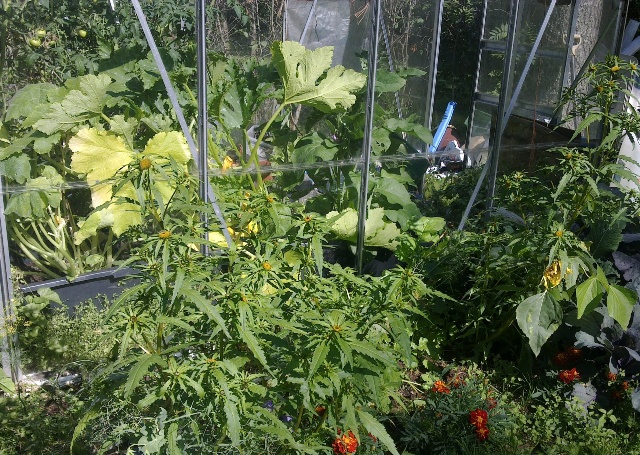 Tänään kun oli lyhyempi päivä, ennätin kotona pihallekin. Kasvihuone ja kohopenkki kaipasivat kastelua, ja aina sitä ruosimista siellä riittää. Keräsin ensimmäiset tuleentuneet härkäpavut. Taitoin mukavan kokoisen kesäkurpitsan salaattiin. Ensi kesänä taidan laittaa kesäkurpitsaa kasvamaan pelkästään ulos kohopenkkiin, enkä enää yritäkään sitä suotta kasvihuoneessa, koskapa se näyttäisi paremmin menestyvät ulkosalla, kumma kyllä.